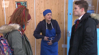 Hannah arrives at the chippy; Britt says that she ought to be at school. “We’ve got a free lesson,” Hannah replies, and adds that she wants a word.